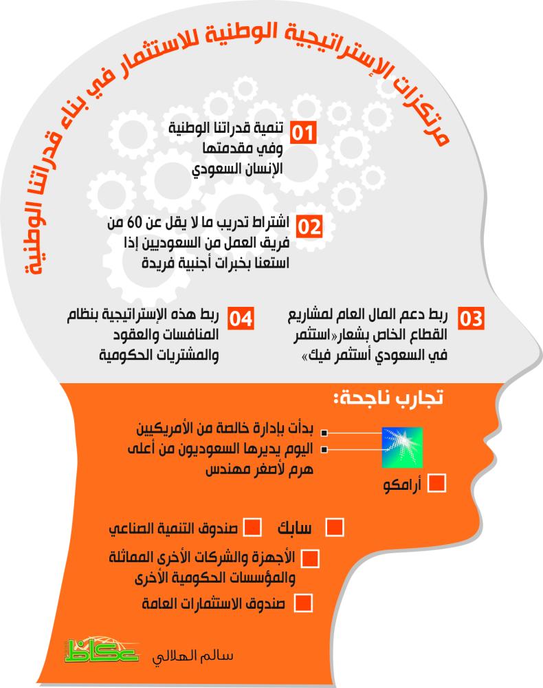 وهنا تحضرني تجربة نجاح سعودية خالصة ألا وهي تجربة «أرامكو»، شركة الطاقة الأكبر في العالم. عندما بدأت أرامكو كانت تُدار من قبل الأمريكيين من أعلى السلم الإداري في الشركة إلى مُشغل السنترال، واليوم ولله الحمد تتولى إدارة الشركة سواعد وعقول وطنية خالصة من رئيس مجلس الإدارة إلى أصغر مهندس في حقول البترول. كيف تمت هذه التجربة التي من الأحرى بنا استنساخها؟ نجاح هذه التجربة يعود بعدالله عز وجل إلى الملك المؤسس عبدالعزيز بن عبدالرحمن -طيب الله ثراه-، الذي أدرك بحكمته وبعد نظره أن مستقبل هذه البلاد يعتمد بعد الله عز وجل على سواعد وعقول أبنائها.
