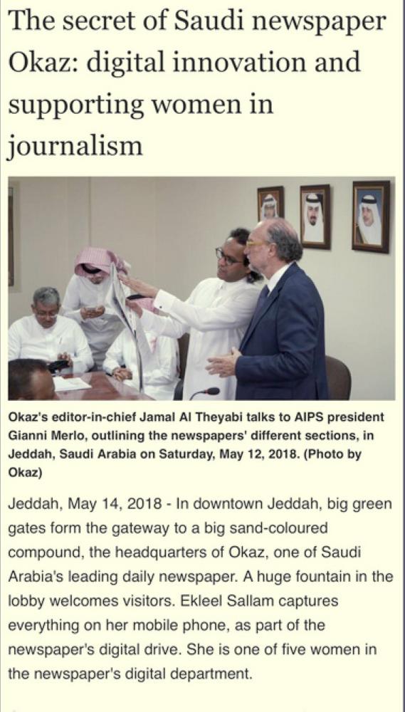 أشاد رئيس الاتحاد الدولي للإعلام الرياضي جياني ميرلو بصحيفة «عكاظ» عبر موقع الاتحاد الدولي.