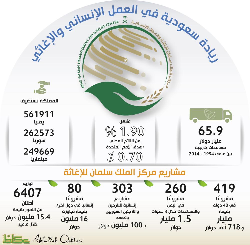 أكد المستشار في الديوان الملكي المشرف العام على مركز الملك سلمان للإغاثة والأعمال الإنسانية الدكتور عبدالله بن عبدالعزيز الربيعة أن المملكة عبر تاريخها الحافل انتهجت دورا رائدا في العمل الإنساني والإغاثي من خلال خدمة دول العالم المحتاجة، إدراكا منها لأهمية هذا الدور في تخفيف المعاناة الإنسانية ولضمان الحياة الكريمة للمستضعفين والمحتاجين، حيث بلغت المساعدات الخارجية للمملكة 65.9 مليار دولار بين عامي 1994 - 2014، مما يشكل 1.90% من نسبة المساعدات الإنمائية الرسمية من الناتج المحلي الإجمالي، وهي نسبة تفوق هدف الأمم المتحدة للمساعدة الإنمائية المقدرة بـ0.70%.