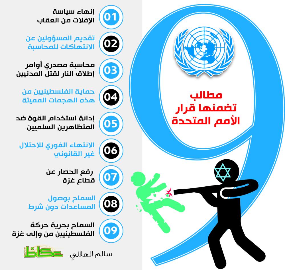 وأدان القرار استخدام قوات الاحتلال الإسرائيلي للقوة المفرطة ضد الفلسطينيين، خاصة المتظاهرين السلميين في قطاع غزة في انتهاك صارخ للقانون الدولي واتفاقيات جنيف لحماية المدنيين تحت الاحتلال.