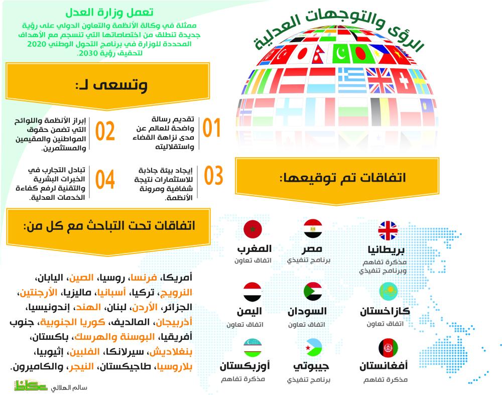 وتتضمن هذه الاتفاقات تعزيز التعاون مع الدول المتقدمة في مجال الخدمات العدلية، وتبادل الخبرات والتعاون في تقديم المساعدات القضائية والقانونية، والقيام بالعديد من البرامج التدريبية لتطوير أداء الموارد البشرية، وكذلك إبراز الأنظمة واللوائح والتعليمات التي تضمن حقوق المواطنين والمقيمين والمستثمرين السعوديين والأجانب في المملكة؛ بما يجعل المملكة بيئة جاذبة للاستثمارات نتيجة شفافية ومرونة الأنظمة وتقدم القضاء، من خلال إصدار الحكم الناجز والمجود.