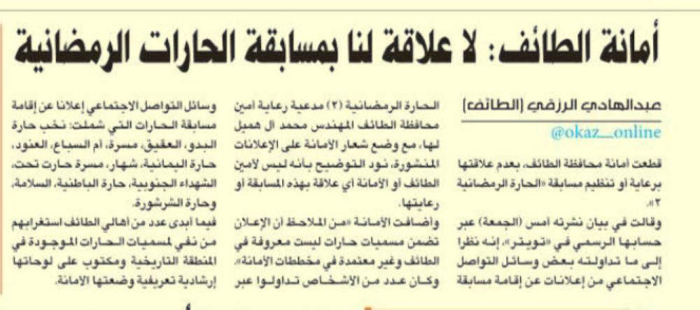 وكانت شرارة الخلاف نشبت بعدما روج الحساب لرعاية الأمانة لمسابقة باسم «الحارات 3»، التي تم ترويجها على تويتر، إلا أن الأمانة سارعت بنفي علاقتها بالرعاية أو بالمسابقة، وأكدت في بيان لها (نشرته «عكاظ») أن الإعلان تضمن مسميات حارات ليست معروفة في الطائف وغير معتمدة في مخططات الأمانة.