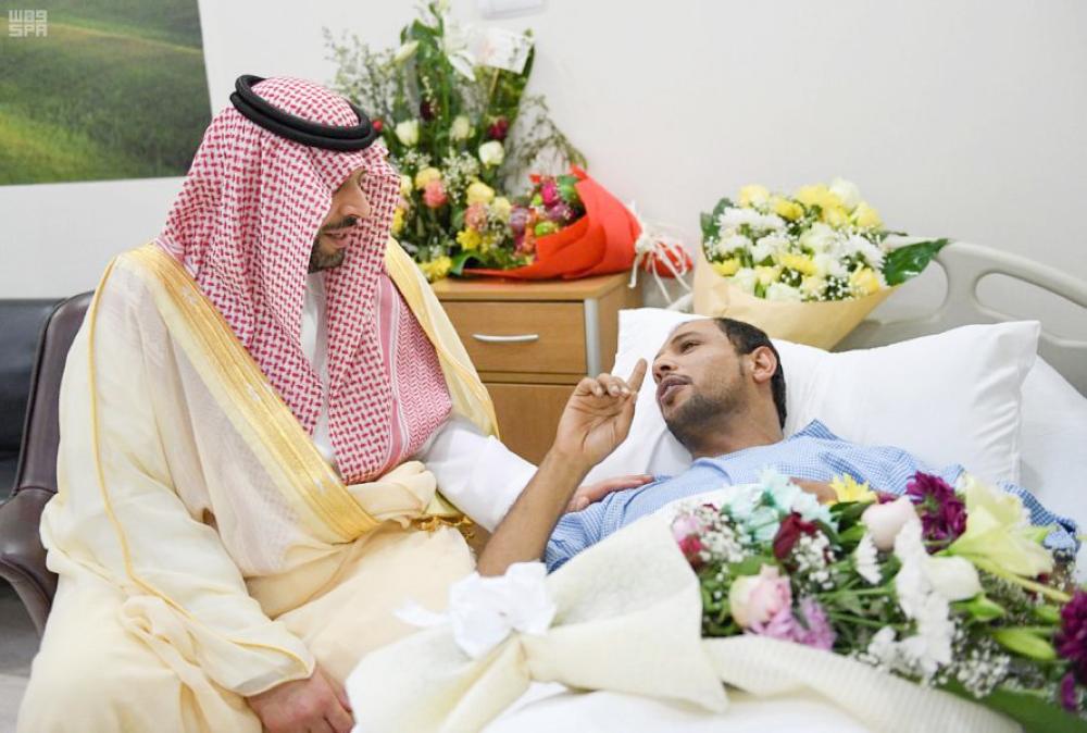الأمير فيصل بن خالد مطمئنا على الدهمشي. (عكاظ)