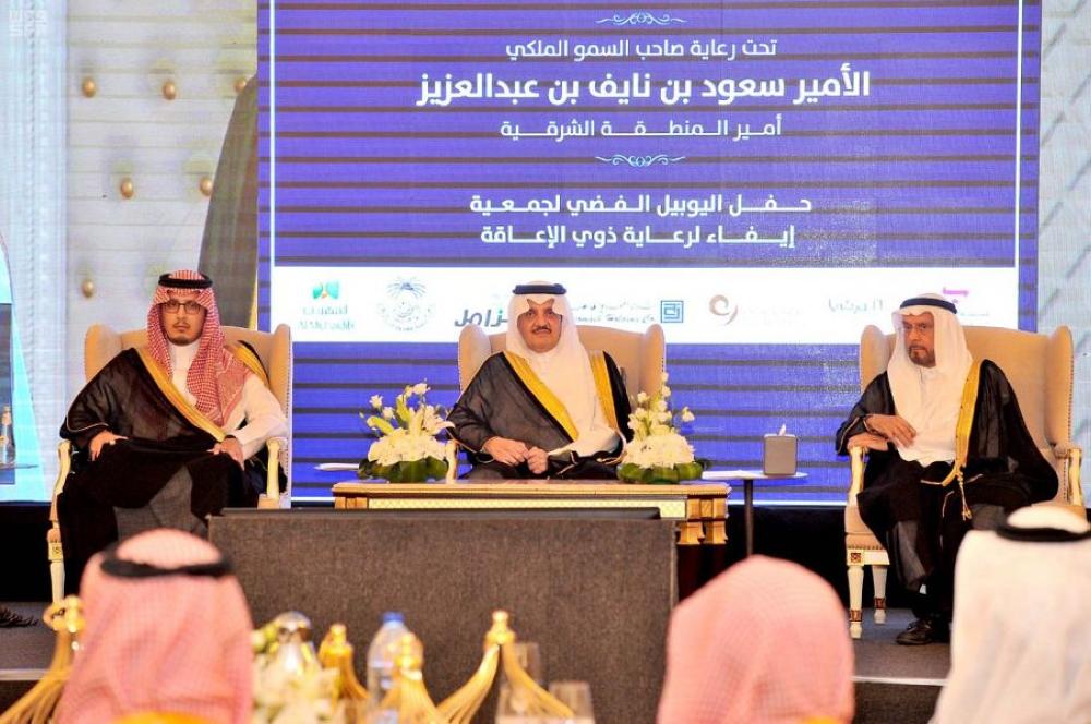 رعى أمير المنطقة الشرقية الأمير سعود بن نايف بن عبدالعزيز، بحضور نائب أمير المنطقة الشرقية الأمير أحمد بن فهد بن سلمان، وحضور عدد من رجال الأعمال مساء أمس (الثلاثاء)، حفلة اليوبيل الفضي لجمعية «إيفاء» لرعاية ذوي الإعاقة، وذلك بفندق كمبنكسي العثمان في محافظة الخبر.