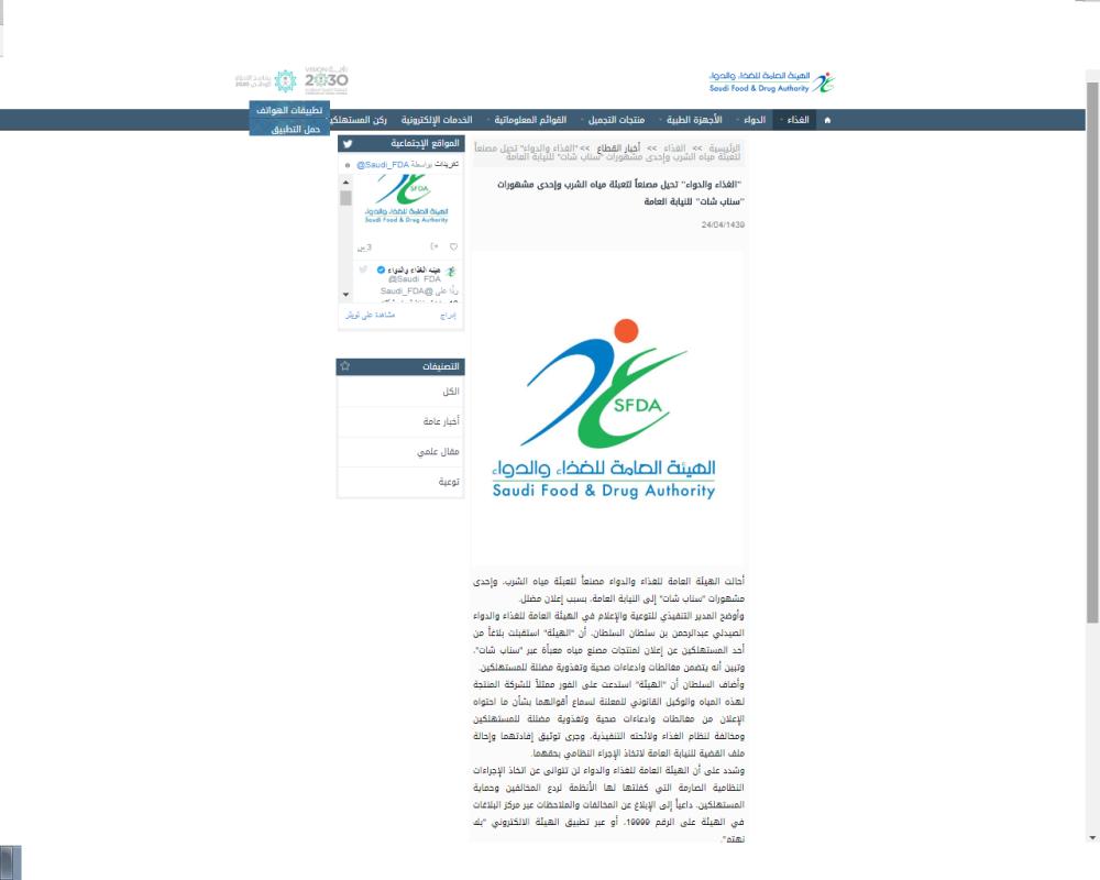 يذكر أن المدير التنفيذي للتوعية والإعلام في الهيئة العامة للغذاء والدواء الصيدلي عبدالرحمن بن سلطان السلطان، أكد في تصريح سابق منشور على موقع الهيئة أن «الهيئة» استقبلت بلاغاً من أحد المستهلكين عن إعلان لمنتجات مصنع مياه معبأة عبر «سناب شات»، وتبين أنه يتضمن مغالطات وادعاءات صحية وتغذوية مضللة للمستهلكين، وتم استدعاؤهم وتوثيق إفادتهم وإحالة ملف القضية للنيابة العامة.