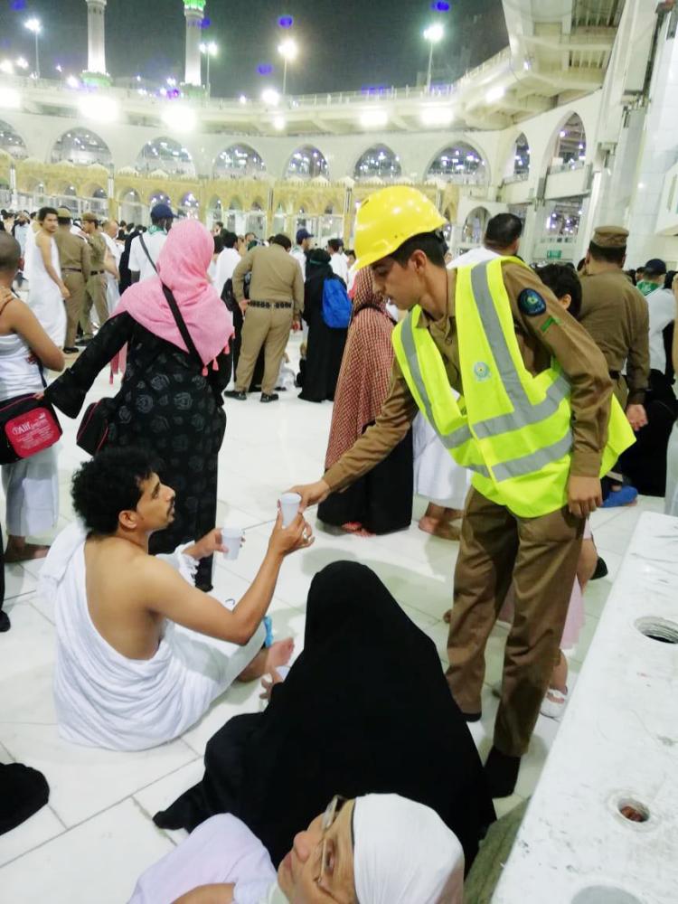أحد رجال الدفاع المدني يخدم المعتمرين في الحرم. (عكاظ)