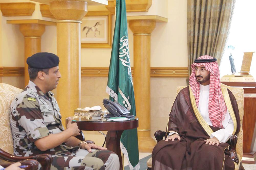 الأمير عبدالله بن بندر خلال استقباله قائد قوات الطوارئ بجدة. (عكاظ)