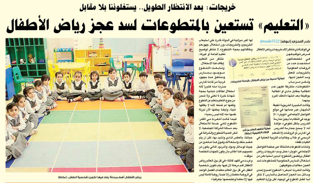 فيما تفاجأت لانا محمد، بسد احتياجات معلمات الروضات بالمتطوعات، مؤكدة أن ذلك ليس بتطوع، معتبرة أنه «استغلال للطالبات المتخرجات من كل التخصصات العلمية والأدبية».