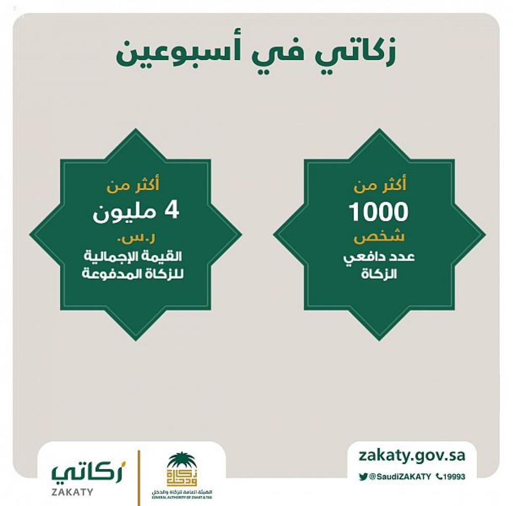 أعلنت الهيئة العامة للزكاة والدخل، أن بوابة (زكاتي) الإلكترونية، وتطبيق (زكاتي) للهواتف الذكية، نجحت في تقديم الخدمة لأكثر من ( 1000 ) شخص من دافعي الزكاة، قاموا بدفع أكثر من 4 ملايين و400 ألف ريال وذلك خلال أسبوعين من إطلاق البوابة ليتمّ توجيه أموال الزكاة المحصلة مباشرة إلى برنامج الضمان الاجتماعي لتصرف على المستفيدين من البرنامج.