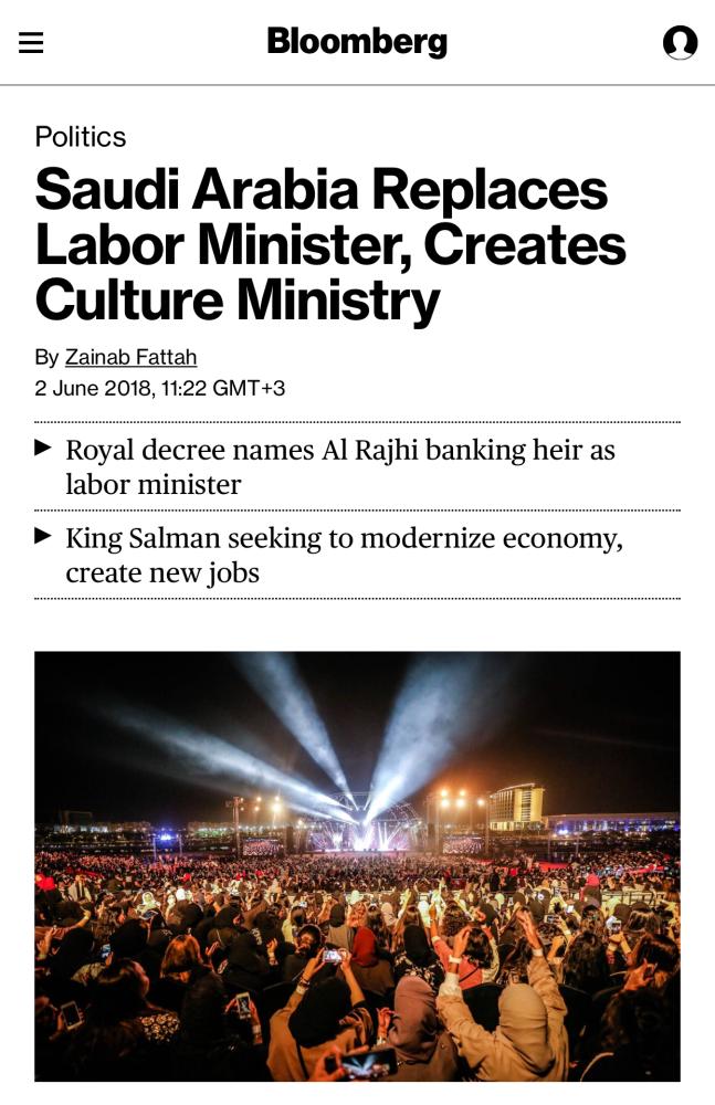 وعنونت «بلومبيرغ» الأمريكية في تقرير لها «المملكة تعين وزيرا جديدا للعمل وتنشئ وزارة جديدة للثقافة».