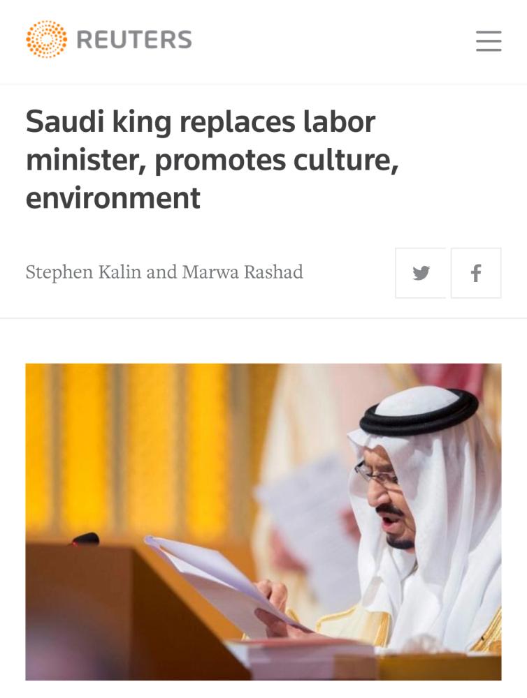 بدورها قالت وكالة رويترز إن الملك سلمان أصدر أوامر ملكية من خلال تغيير وزير العمل، كما عززت أوامره الثقافة والبيئة، مشيرة إلى أن المملكة تسعى إلى خلق أكثر من مليون وظيفة بحلول العام ٢٠٢٢ وتقليل نسب البطالة إلى دون ٩٪.