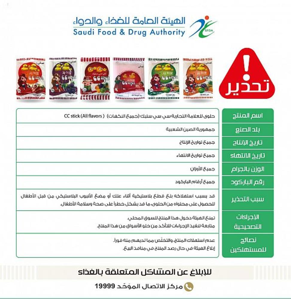 حذّرت الهيئة العامة للغذاء والدواء من منتج حلوى يحمل العلامة التجارية سي سي ستيك CC-Stick، تم إنتاجه بجمهورية الصين الشعبية، قد يسبب استهلاكه ببلع قطع بلاستيكية أثناء علك أو مضغ الأنبوب البلاستيكي من الأطفال للحصول على محتواه من الحلوى، ما قد يشكل خطراً على صحة وسلامة الأطفال.