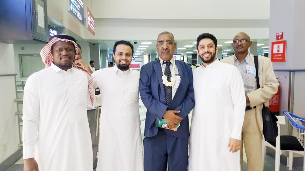 عبدالنبي النوبي محاطا بأحبائه لدى مغادرته. (عكاظ)