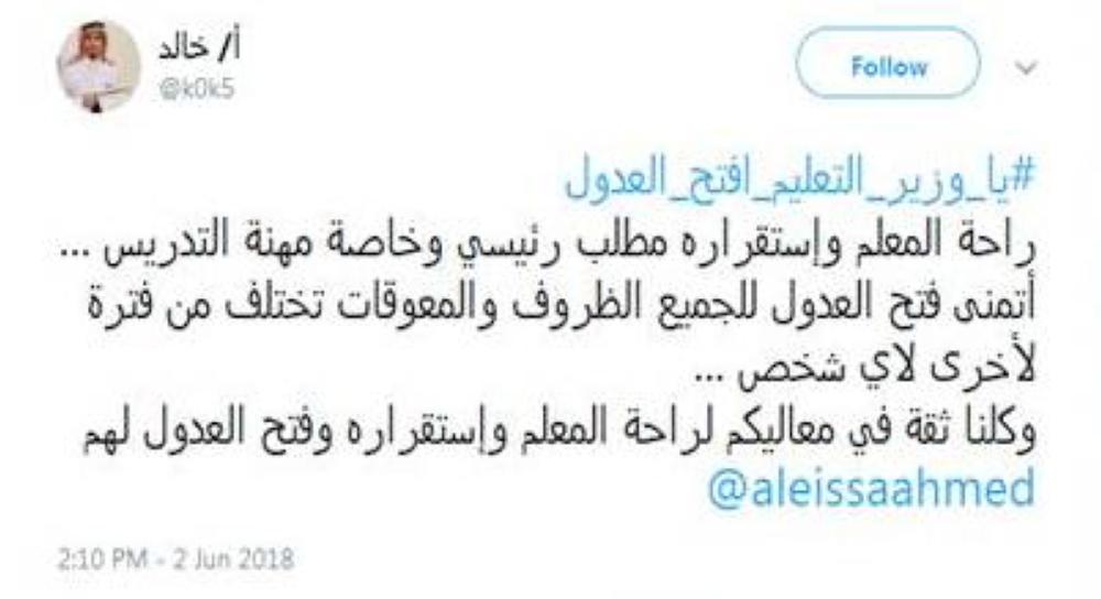 ويتساءل آخر «ما المانع من فتح العدول، الوزارة تبحث عن استقرار وراحة المعلمين والمعلمات، البعض كان لديه ظروف تجبره على البقاء في منطقته الحالية؟»