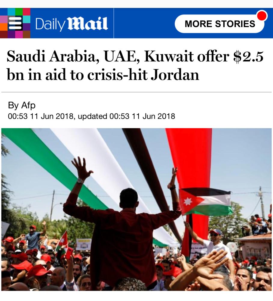 وفي هذا الصدد، قالت صحيفة الديلي ميل البريطانية في تقرير لها فجر أمس (الإثنين) إن السعودية والإمارات والكويت تعهدت بدفع 2.5 مليار دولار لصالح الأردن، لمساعدته على مواجهة الأزمة الاقتصادية التي تعصف بالبلاد. ولفت التقرير إلى أن هذه المساعدات المالية تأتي لتخفيف أزمة عَمّان الاقتصادية عقب موجة من الاحتجاجات بسبب سياسة التقشف التي اتبعتها حكومة رئيس الوزراء المستقيل هاني الملقي.