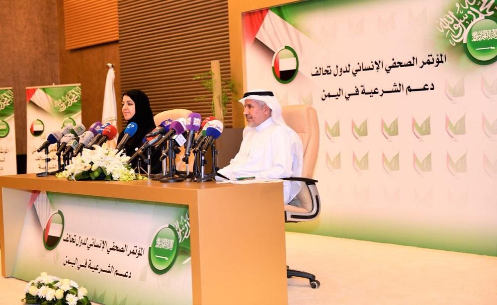 عقد المشرف العام على مركز الملك سلمان للإغاثة والأعمال الإنسانية الدكتور عبدالله بن عبدالعزيز الربيعة ووزيرة الدولة الإماراتية لشؤون التعاون الدولي ريم إبراهيم الهاشمي اليوم (الأربعاء) مؤتمراً صحفياً مشتركاً «لدول تحالف دعم الشرعية في اليمن» بالرياض.