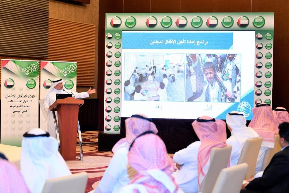 عقب ذلك، قدم الدكتور عبدالله الربيعة شرحًا عن المساعدات السعودية الإنسانية والإغاثية المقدمة إلى اليمن، حيث بلغ إجمالي المساعدات الإنسانية من مايو 2015 حتى الآن مليار دولار أمريكي، فيما بلغ عدد المشاريع التي نفذها مركز الملك سلمان للإغاثة والأعمال الإنسانية في اليمن 262 مشروعًا عبر 80 شريكًا محليًا وأمميًا، شملت مجالات الصحة والأمن الغذائي والتعافي المبكر والإيواء والمياه والإصحاح البيئي والتعليم والتغذية والحماية وغيرها، فيما خصص 71 مشروعًا إنسانيًا وإغاثيا للمرأة و83 مشروعًا إنسانيًا وإغاثيًا للطفل.