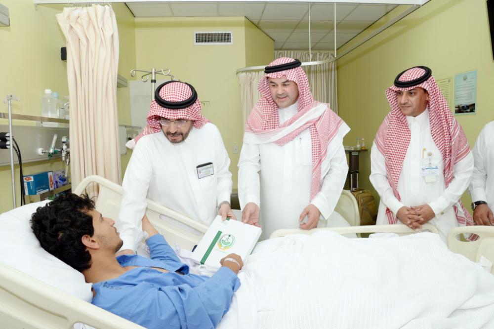 الدكتور السحيمي والعقيد الميمان أثناء معايدة أحد رجال الأمن المنومين بالرياض. (عكاظ)