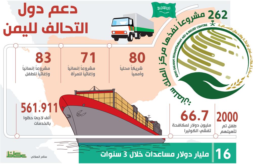 وكانت المساعدات المقدمة من دول تحالف دعم الشرعية في اليمن خلال 3 سنوات، بلغت 16 مليار دولار أمريكي شملت المواد الغذائية والمساعدات الطبية والمواد الإيوائية والدعم المجتمعي والتعليم ومساعدة اللاجئين ودعم الاقتصاد والبنك المركزي اليمني وتقديم البرامج التنموية والدعم الثنائي، إلى جانب البرامج الأخرى المختلفة.