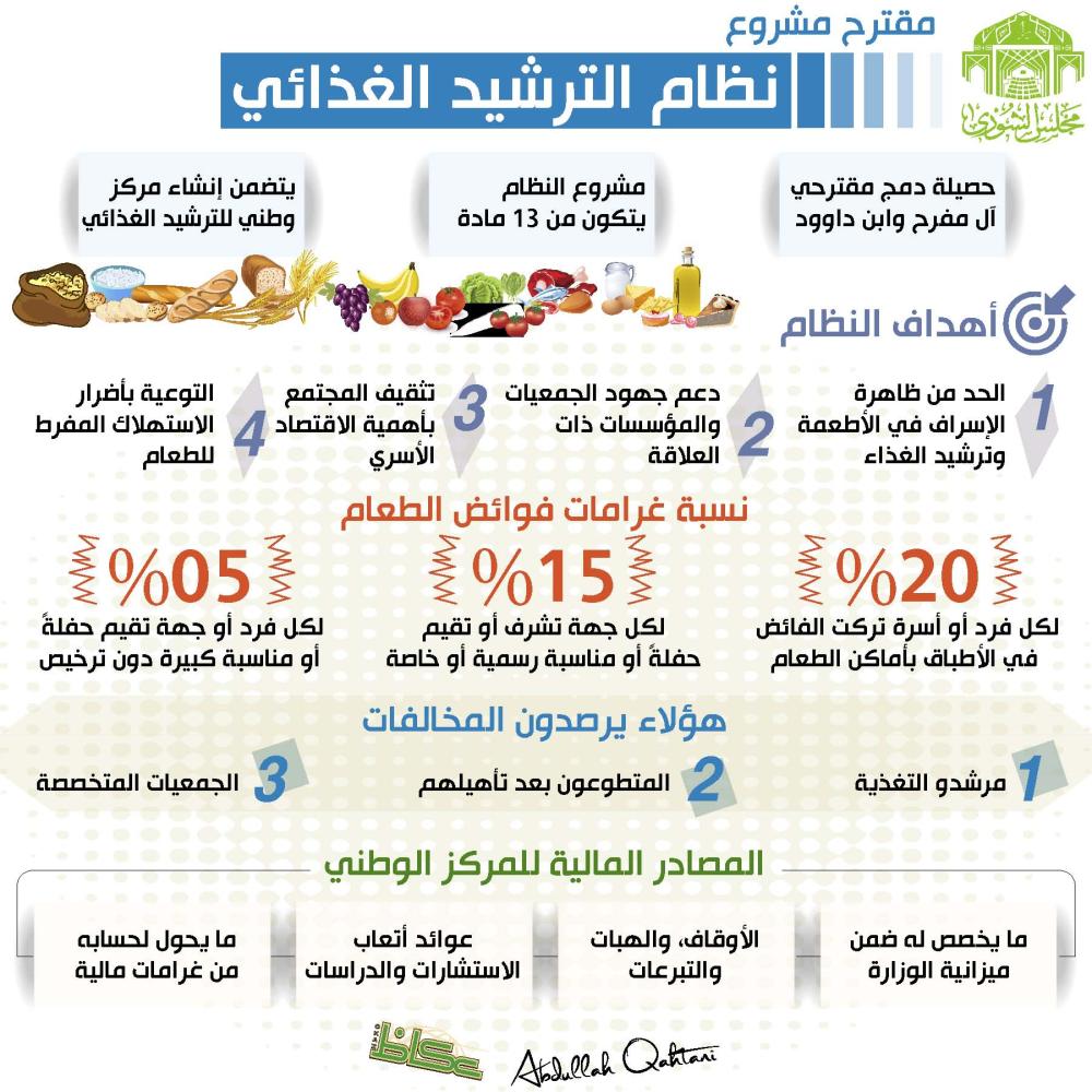 سعياً لوضع حد للاستهلاك الجائر للغذاء واستنزاف موارده ولمنع العبث بفوائض الطعام، حدد مجلس الشورى يوم الأربعاء القادم موعداً لمناقشة تقرير لجنة الشؤون الاجتماعية بشأن دراسة مقترح مشروع نظام الترشيد الغذائي، المقدم من عضو المجلس السابق أحمد آل مفرح، والذي رأت اللجنة دمجه مع مقترح آخر لإعداد تشريع لمكافحة البطر وكفر النعمة، المقدم من العضو السابق ناصر بن داوود، متضمنا عقوبات رادعة لبعض ممارسات المفاخرة في الولائم ولا يحتاطون لفوائضها، فترمى في حاويات النفايات.