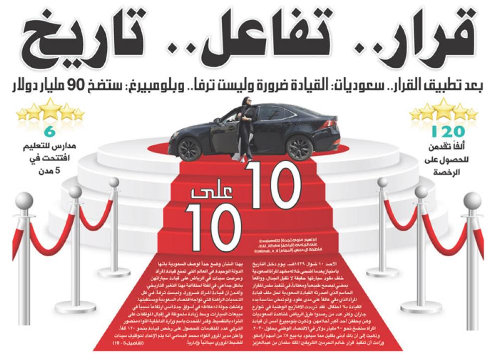 الأحد 10 شوال 1439هـ.. يوم دخل التاريخ بامتياز بعدما أضحى خلاله مشهد المرأة السعودية خلف مقود سيارتها حقيقة لا تقبل الجدال، وواقعاً يمضي ليصبح طبيعياً ومعتاداً، في تنفيذ سلس للقرار الحاسم الذي أصدرته القيادة السعودية لحل ملف قيادة المرأة الذي بقي عالقاً على مدى عقود.
