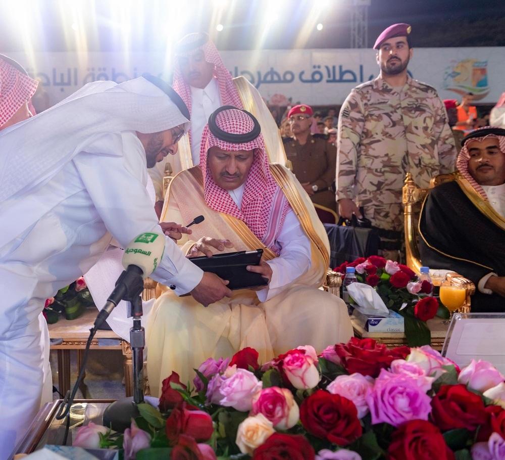 بعدها كرّم أمير منطقة الباحة المنظمين والرعاة والداعمين ووكالة الأنباء السعودية والتلفزيون السعودي، فيما تسلم هدية تذكارية مقدمة من أمين المنطقة رئيس اللجنة الرئيسية للفعاليات والمهرجان الدكتور علي السواط، كما تسلم هدية مماثلة من الجهة المنظمة للحفل.
