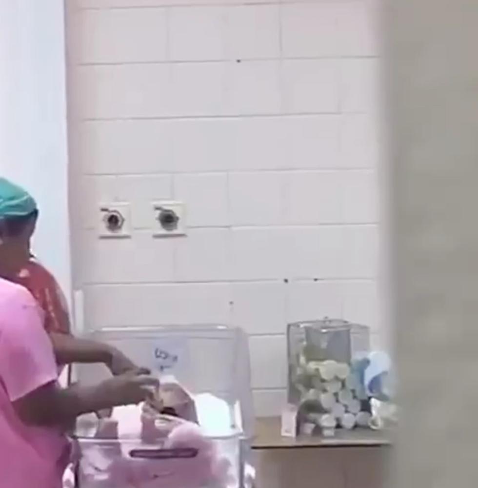الممرضة مع الرضيع كما ظهرت في مقطع تداولته منصات التواصل. (عكاظ)