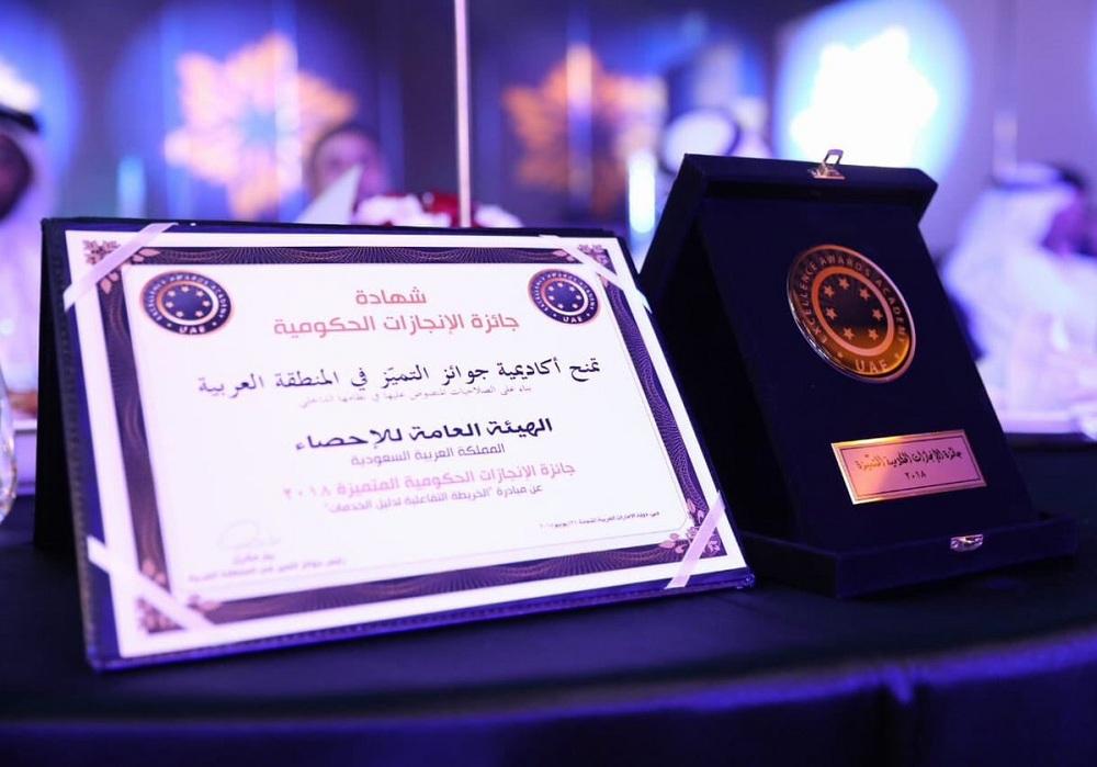 وأعلنت أكاديمية جوائز التميز بدولة الإمارات العربية المتحدة على مستوى المنطقة العربية الجهة المنظمة لجوائز «أفكار» للابتكار الحكومي المتميز للعام 2018 أمس (الثلاثاء) في دبي، أنَّه تم اختيار خدمة الخريطة التفاعلية لدليل الخدمات التي أصدرته الهيئة العامة للإحصاء ضمن سبع خدمات مميزة على مستوى المنطقة بين أكثر من 47 خدمة ترشحت للفوز بالجائزة.