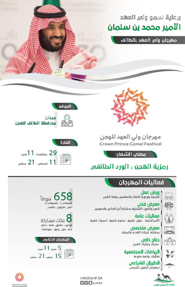 أطلق الاتحاد السعودي للهجن اليوم (السبت) شعار وبرنامج مهرجان ولي العهد للهجن المقرر إقامته في ميدان محافظة الطائف للهجن خلال الفترة من يوم السبت 29 ذي القعدة 1439هـ، الموافق 11 أغسطس 2018م، حتى يوم الجمعة 11 محرم 1440هـ، الموافق 21 سبتمبر 2018م، وذلك في ميدان محافظة الطائف للهجن، تحت رعاية الأمير محمد بن سلمان بن عبدالعزيز ولي العهد نائب رئيس مجلس الوزراء وزير الدفاع.