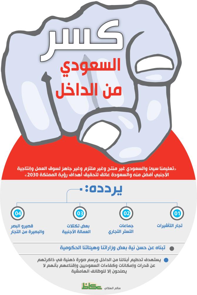 «تعليمنا سيئ والسعودي غير منتج وغير ملتزم وغير جاهز لسوق العمل وإنتاجية الأجنبي أفضل منه والسعودة عائق لتحقيق أهداف رؤية المملكة 2030»، هذا ليس أحد خطابات حسن نصرالله ولا عبدالملك الحوثي أو قاسم سليماني بل خطاب مجموعة من الداخل امتهنت تقزيم وتحقير وتكسير مجاديف كل ما هو سعودي ووصف الشاب السعودي بأنه كسول وغبي ولا يعتمد عليه وأنه لا أمل في تحقيق الرؤية دون شرعنة التستر التجاري وفتح باب الهجرة والإقامة الدائمة وربما التجنيس لاستقطاب ما يطلقون عليهم العقول والسواعد المنتجة التي في رأيهم لم يعد لها وجود في أحفاد الرجال الذين سطروا واحدة من أعظم الملاحم في التاريخ الحديث ألا وهي توحيد وبناء هذه البلاد المباركة تحت قيادة وراية الملك المؤسس عبدالعزيز بن عبدالرحمن -طيب الله ثراه- الذي آمن بأجدادهم وبقدراتهم وأعطوه بيعتهم والتفوا حوله ووحدوا وبنوا جميعاً الدولة المعجزة التي خلال أقل من 90 عاماً تحولت بفضل عقول وسواعد أجدادهم ومن بعدهم آباؤهم من صحار قاحلة إلى دولة عصرية مزدهرة وواحدة من أكبر عشرين اقتصاداً في العالم بأسره.
