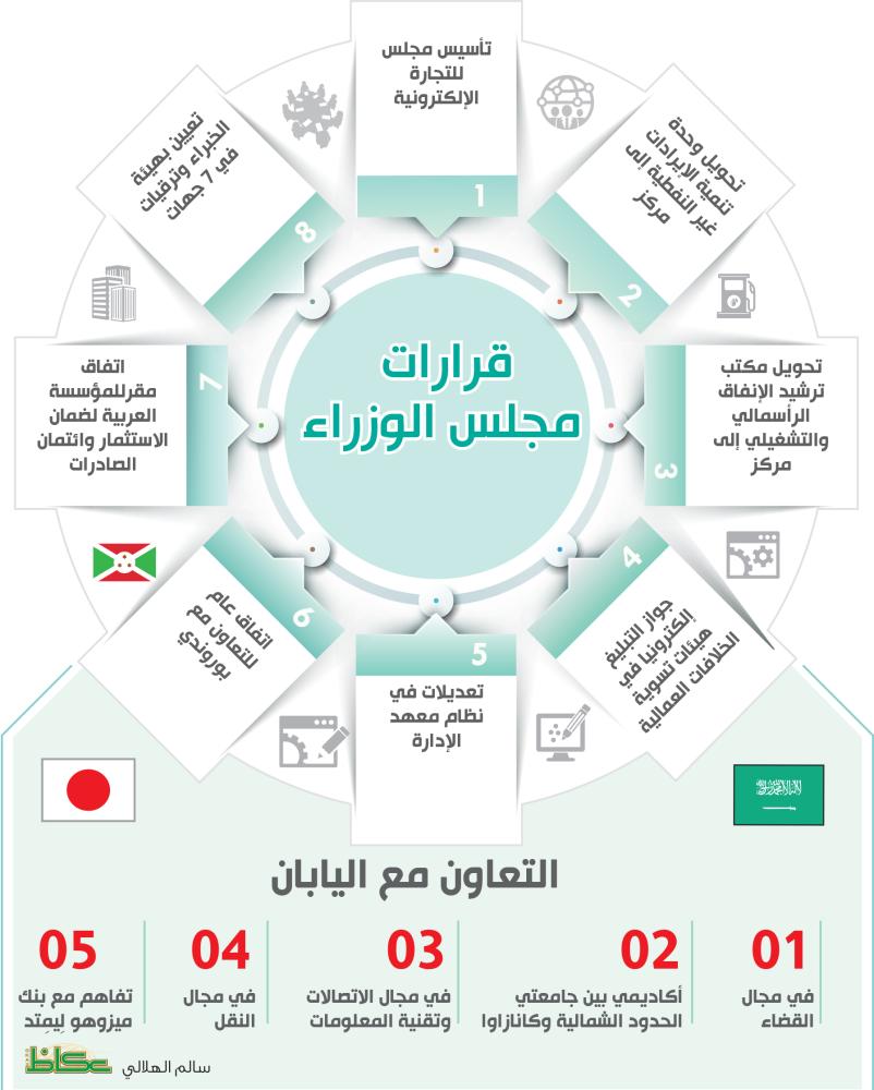 وافق مجلس الوزراء برئاسة خادم الحرمين الشريفين الملك سلمان بن عبدالعزيز، على تأسيس مجلس للتجارة الإلكترونية برئاسة وزير التجارة والاستثمار، فيما أقر تحويل وحدة تنمية الإيرادات غير النفطية إلى مركز باسم (مركز تنمية الإيرادات غير النفطية)، ومكتب ترشيد الإنفاق الرأسمالي والتشغيلي إلى مركز باسم «مركز تحقيق كفاءة الإنفاق».* استقرار أسواق النفط أحد أهم أهداف السياسة السعودية