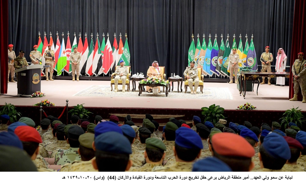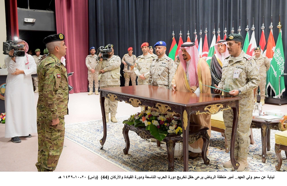 نيابة عن ولي العهد نائب رئيس مجلس الوزراء وزير الدفاع الأمير محمد بن سلمان بن عبدالعزيز، رعى أمير منطقة الرياض فيصل بن بندر بن عبدالعزيز، أمس حفل تخريج دورة الحرب التاسعة، ودورة القيادة والأركان (44)، وذلك بمقر كلية القيادة والأركان.
