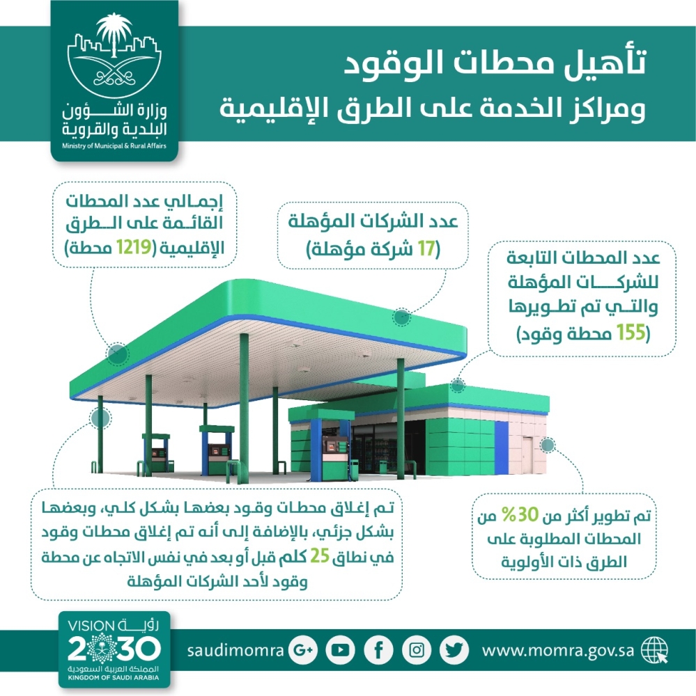 أكدت وزارة الشؤون البلدية والقروية تطوير أكثر من 155 محطة وقود على الطرق الإقليمية، وأكثر من 30% من المحطات المطلوبة ذات الأولوية، ضمن برنامج يستهدف تطوير أكبر عدد من المحطات القائمة على الطرق الإقليمية والبالغ عددها (1219) محطة وذلك لإيجاد بيئة تنافسية بين الشركات لتقديم أفضل الخدمات في محطات الوقود.