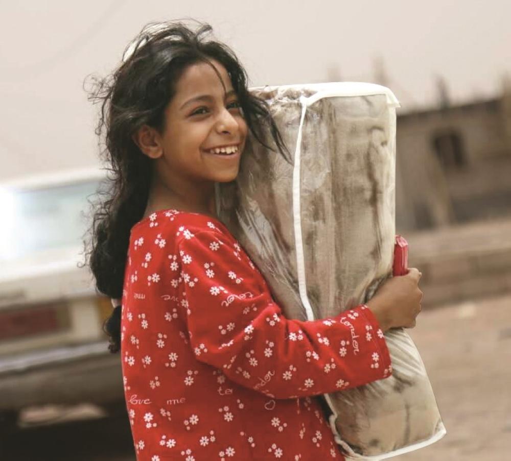 طفلة يمنية نازحة من البيضاء إلى مأرب سعيدة بحصتها من المساعدات الإيوائية.