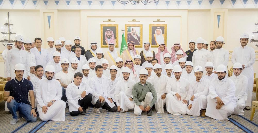 الأمير فيصل بن مشعل مع المهندسين السعوديين عقب رعايته توقيع مذكرة التفاهم. (عكاظ)