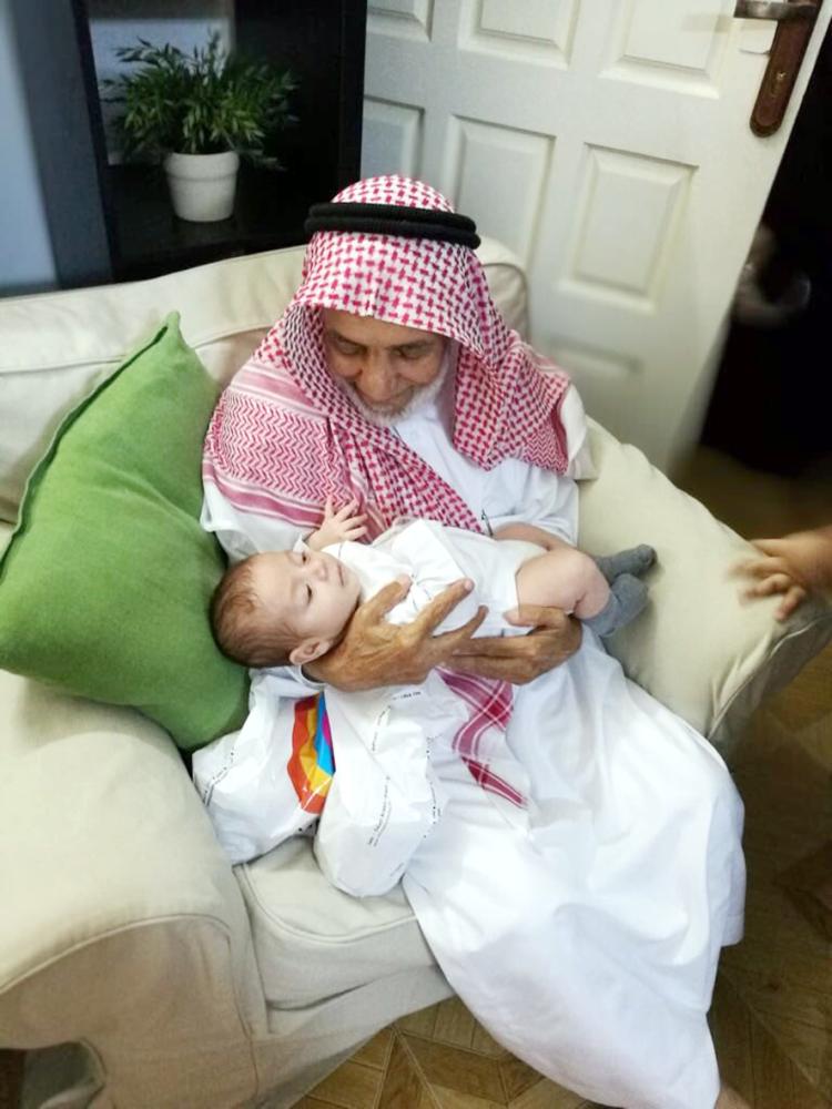 الغامدي يداعب أحد أحفاده قبل السفر واحتجازه.