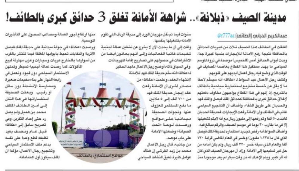 يذكر أن «عكاظ» نشرت أمس الأول تقريرا عن إغلاق 3 متنزهات كبيرة تحت عنوان (مدينة الصيف «ذبلانة».. شراهة الأمانة تغلق 3 حدائق كبرى بالطائف!)، بسبب رفع الأمانه للإيجارات بنسبة تجاوزت 1000% مما تسبب في عزوف المستثمرين عنها.