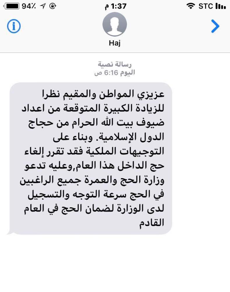 وكانت مواقع التواصل الاجتماعي قد تداولت رسالة نصية مضمونها أنه نظرا للزيادة الكبيرة المتوقعة في أعداد ضيوف بيت الله الحرام من حجاج الدول الإسلامية وبناء على التوجيهات الملكية فقد تقرر إلغاء حج الداخل هذا العام.