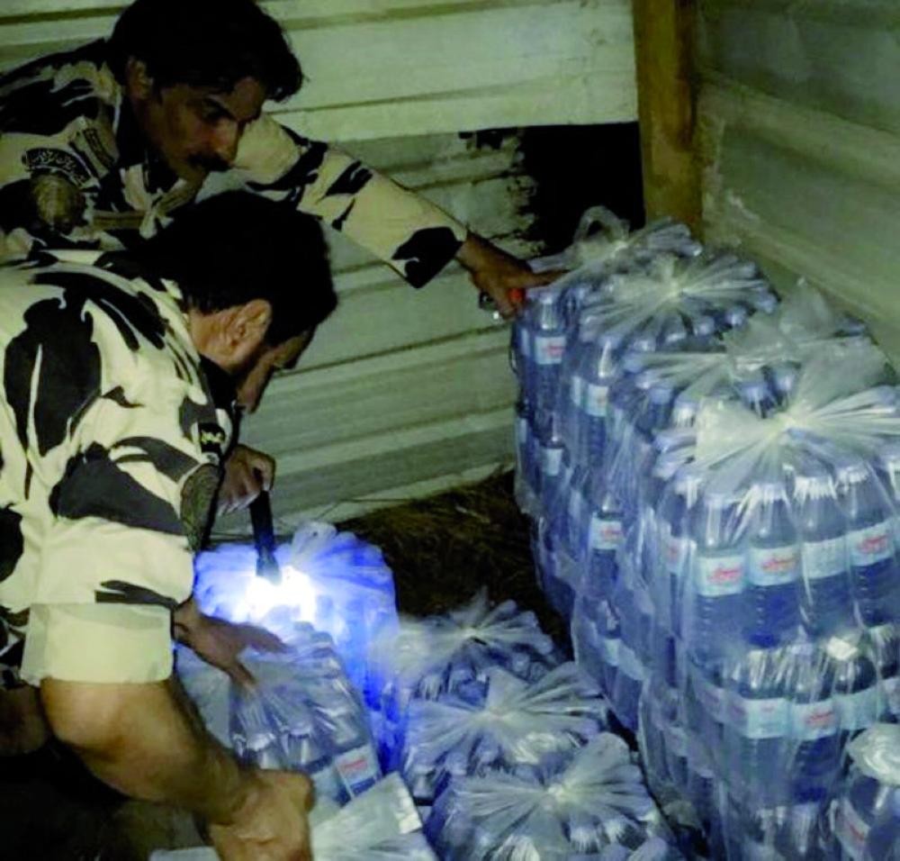 رجلان من قوة الطوارئ خلال ضبط الخمور. (عكاظ)