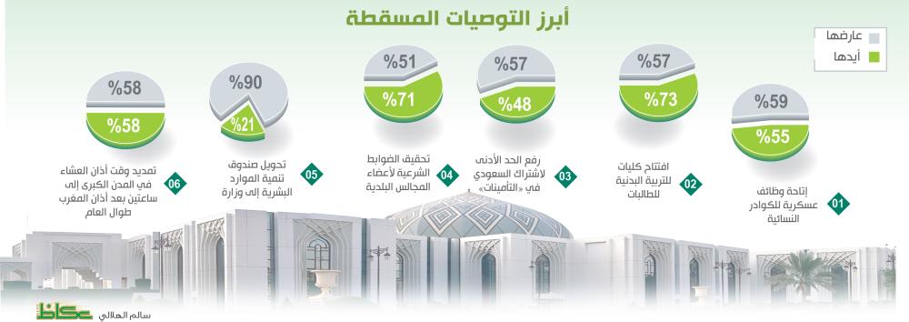 وبشأن توصية تحقيق الضوابط الشرعية لأعضاء المجالس البلدية خلال الاجتماعات الدورية التي قدمت على تقرير وزارة الشؤون البلدية والقروية، وتنص التوصية على: «الإيفاء بما تتطلبه المادة 66 من نظام المجالس البلدية القاضي بتحقيق الضوابط الشرعية لأعضاء المجلس من الجنسين، وإعادة النظر في الفقرة 1 من المادة 107 من اللائحة التنفيذية لنظام المجالس البلدية طالما تحققت الضوابط الشرعية»، وهذا التوصية من التوصيات الجديدة التي تبنتها اللجنة أيدها 71 عضوا، وعارضها 51 عضوا.