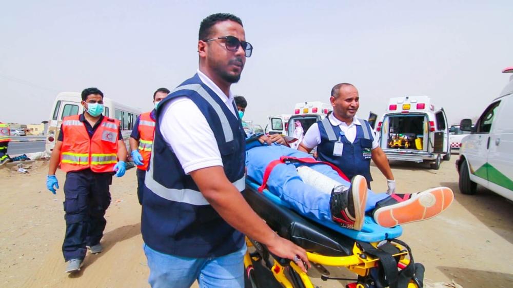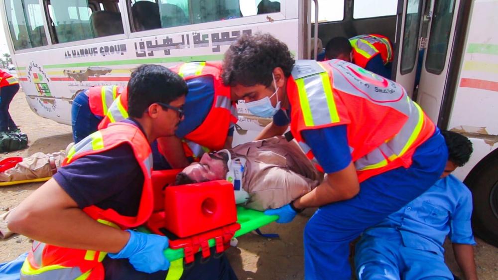 وجاء سيناريو الفرضية بوقوع حادث مروري بإنقلاب حافلة وحدوث ١٠ إصابات على طريق الأمير سلطان.