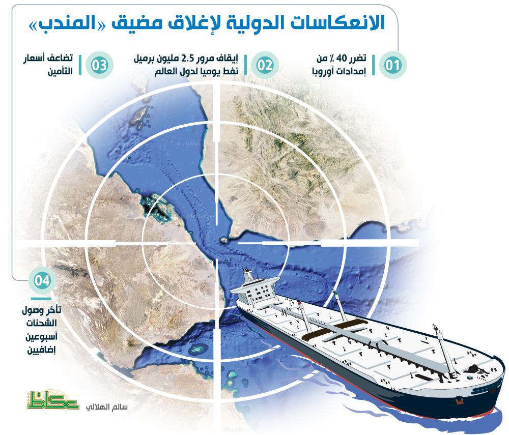 المحلل الاقتصادي محمد الزاكي أشار إلى أن 40% من الشحنات المتوجهة إلى أوروبا تمر عبر مضيق باب المندي الذي يتعرض باستمرار إلى قرصنة حوثية، ويمر عبر المضيق نحو 2.5 مليون برميل يوميا من دول الخليج العربي إلى دول العالم، معتبرا تهديد هذا المعبر سيكلف دول العالم الكثير نتيجة ارتفاع تكاليف الشحن والمرور وارتفاع أسعار التأمين التي سترفع حتما أسعار البترول ومشتقاته إلى مستويات كبيرة.