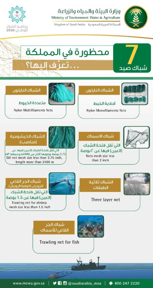 ضبطت وزارة البيئة والمياه والزراعة ممثلة في فرع الثروة السمكية في جدة؛ عدداً من القوارب المخالفة لنظام الصيد الذي يحظر استخدام الشباك النايلون أحادية الخيط (Nylon Monofilaments Nets)، والشباك متعددة الخيوط (Nylon Multifilaments Nets) في المياه الإقليمية للمملكة العربية السعودية، تزامناً مع بدء سريان حظرها في 1439/11/1.