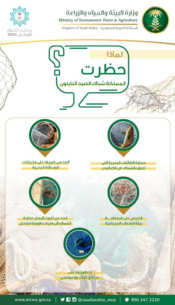 وأفاد الشايع بأن حظر هذه الأنواع من الشباك يأتي حمايةً للثروة المائية الحية في المياه الإقليمية للمملكة؛ لما لها من تأثير سلبي على المخزون السمكي والكائنات البحرية وبيئة الشعاب المرجانية، إضافة إلى ما تلحقه من أضرار بمحركات الوسائط البحرية.