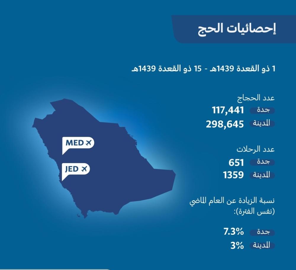 وكشفت الإحصاءات التي أعلنتها هيئة الطيران المدني، أعداد ضيوف بيت الله الحرام القادمين إلى مطار الملك عبدالعزيز الدولي بجدة حيث بلغ نحو (117.441) حاجا، وصلوا عبر (651) رحلة، وبنسبة زيادة في أعداد الحجاج تصل إلى (7%) مقارنة بذات الفترة من العام الماضي 1438، بينما سجل عدد الحجاج القادمين إلى مطار الأمير محمد بن عبدالعزيز الدولي بالمدينة المنورة نحو (298.645) حاجا، قدموا إلى المدينة المنورة عبر (1359) رحلة طيران، وسجل المطار نسبة نمو في أعداد الحجاج القادمين تقدر بـ(3%) قياساً بنفس الفترة من العام الماضي.