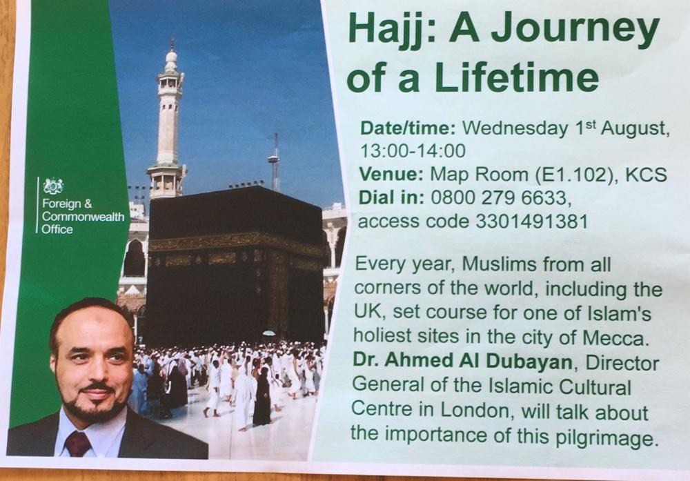 ألقى مدير المركز الثقافي الإسلامي د. أحمد الدبيان محاضرة بعنوان «الحج رحلة العمر» من داخل وزارة الخارجية البريطانية وجاء ذلك بعد دعوة من «الخارجية البريطانية» بمناسبة قرب موسم الحج.
