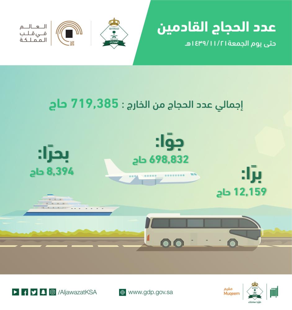 بلغ عدد الحجاج القادمين لأداء مناسك الحج من الخارج عبر الموانئ الجوية والبرية والبحرية منذ بدء القدوم وحتى نهاية يوم أمس (الجمعة) 719.385 حاجاً، بزيادة بلغت 44.157 حاجا على عدد القادمين لنفس الفترة من العام الماضي، بنسبة 6.5% تقريبا، وذلك وفق الإحصاء الذي أصدرته المديرية العامة للجوازات.