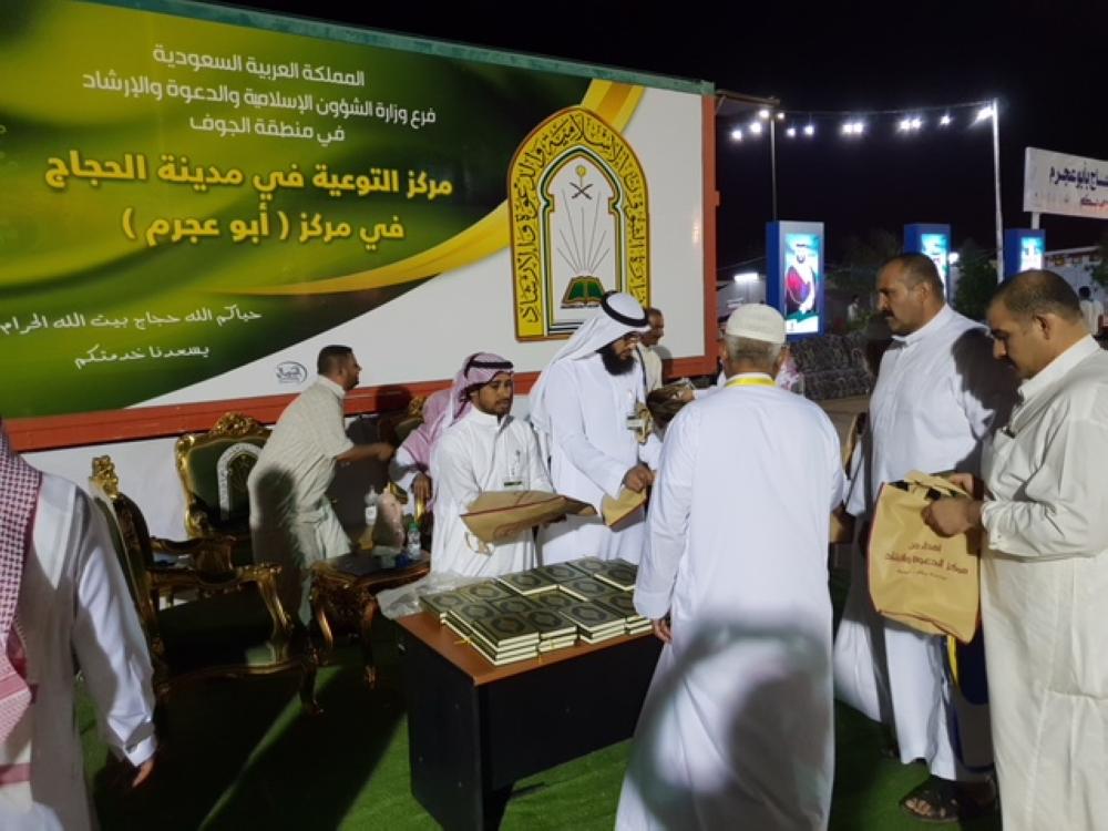 يشارك فرع وزارة الشؤون الإسلامية و الدعوة والإرشاد بمنطقة الجوف بجهود كبيرة مقدمة يوميا عبر مركز التوعية في مدينة الحجاج أبو عجرم، حيث تم توزيع 1500 مصحف بأحجام مختلفة، وكتيبات عن مناسك الحج، وكتيبات عن فضل زيارة مدينة الرسول علية الصلاة والسلام، وكتيبات آداب الحاج.