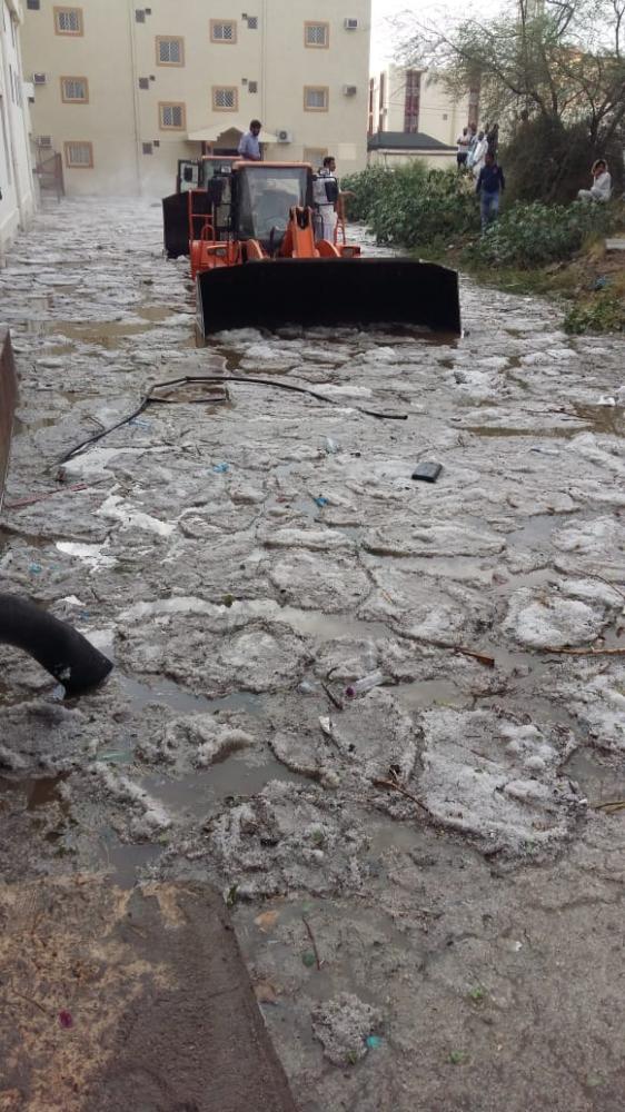 من جهتها، أعلنت بلدية المحافظة على لسان متحدثها بدر القرني، أن التجمعات المطرية في الحي نتجت عن الأمطار الغزيرة المصحوبة بكميات كبيرة من البرد، لافتة إلى أن العوالق الترابية تسببت في انسداد مجرى السيل.