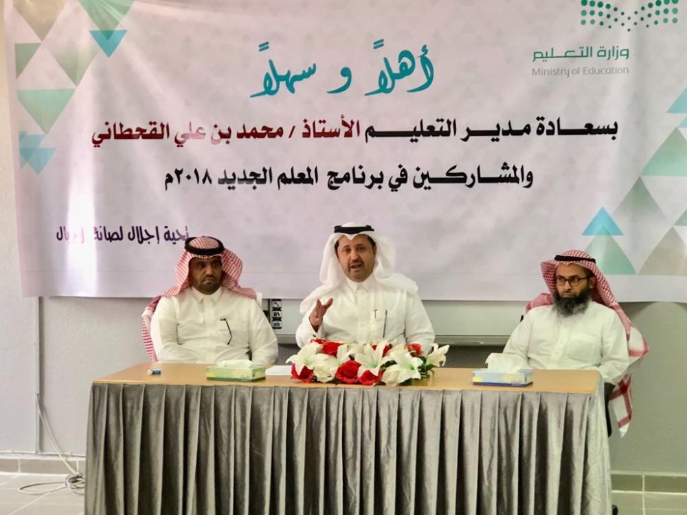 القحطاني ومساعداه في حوار مفتوح مع المعلمين الجدد.